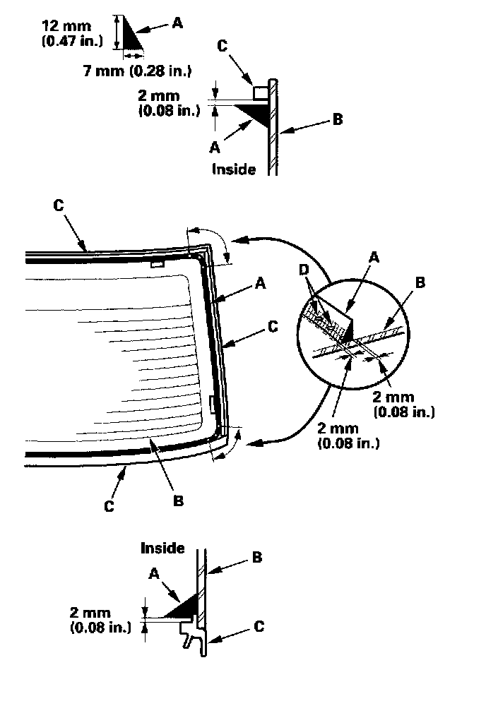 20. Put the cartridge in a caulking gun, and run a bead of adhesive (A) around the edge of the rear window (B) between the dams (C) as shown: