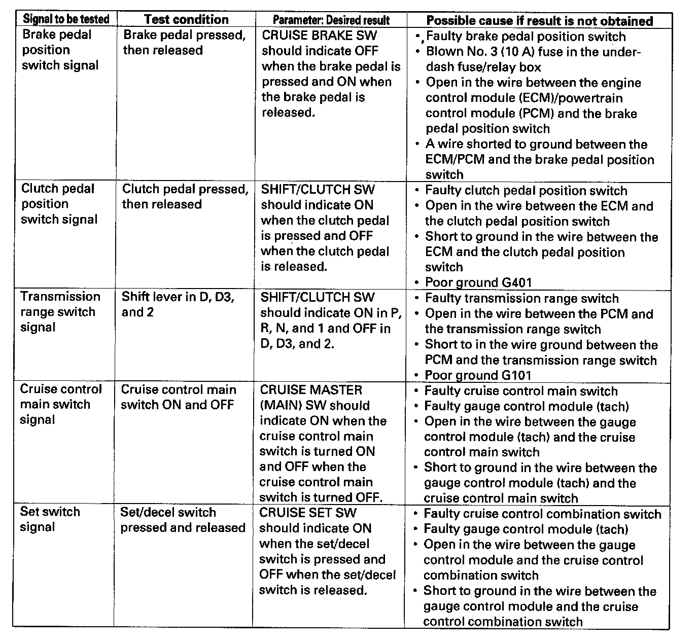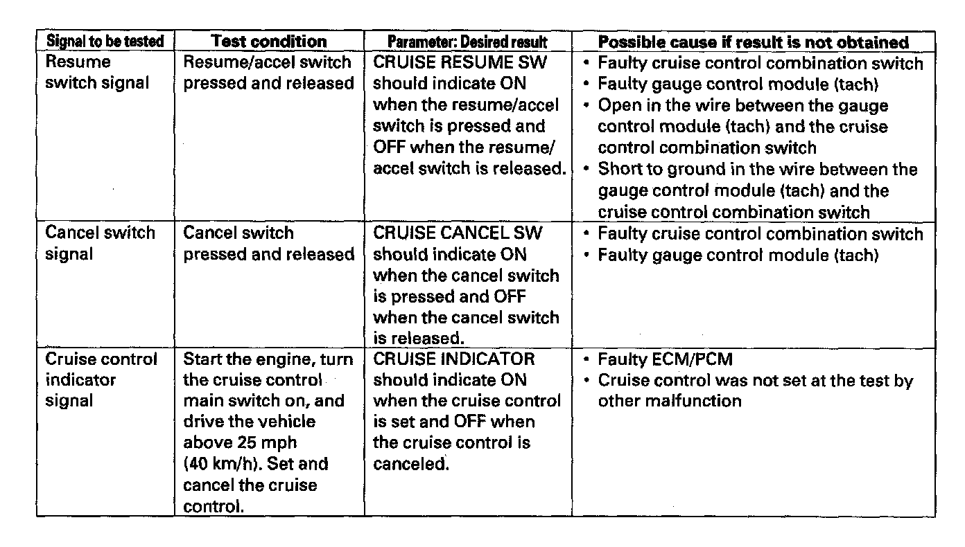 NOTE: Intermittent failures are often caused by loose circuit connections. While monitoring cruise control inputs, flex their circuits, and note if any of the test results change.