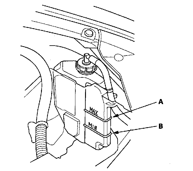 1. Look at the coolant level in the coolant reservoir. Make sure it is between the MAX mark (A) and MIN mark (B).