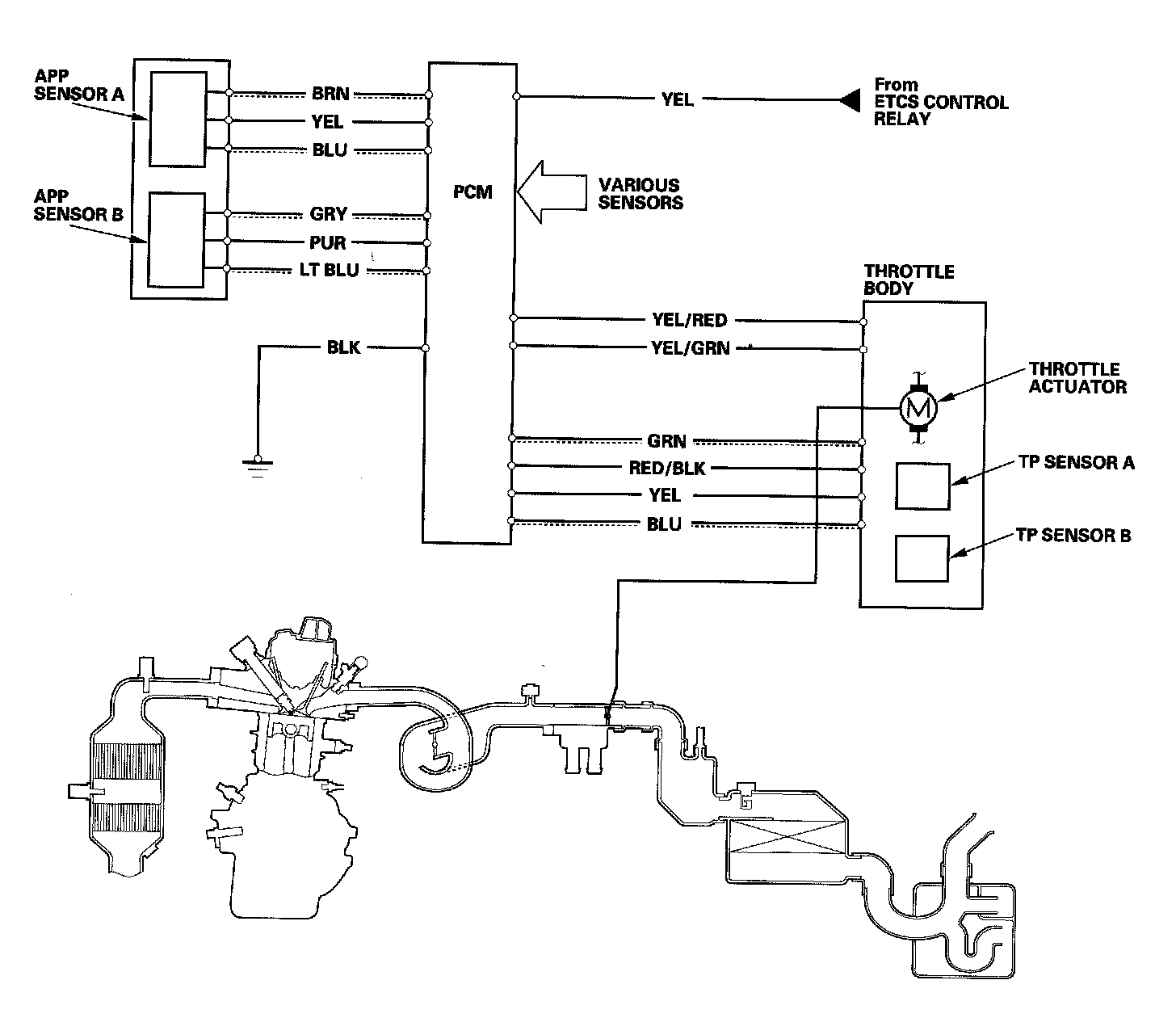 The electronic throttle control system consists of the throttle actuator, throttle position (TP) sensor A/B, accelerator pedal position (APP) sensor A/B, electronic throttle control system (ETCS) control relay, and the PCM.