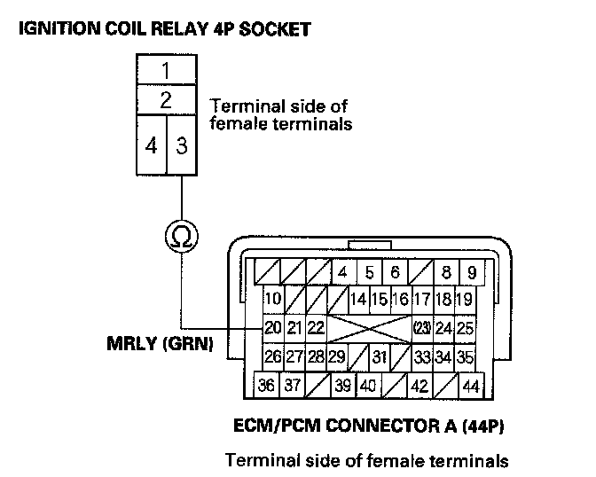 11. Check for continuity between ignition coil relay 4P socket terminal No.3 and ECM/PCM connector terminal A20.