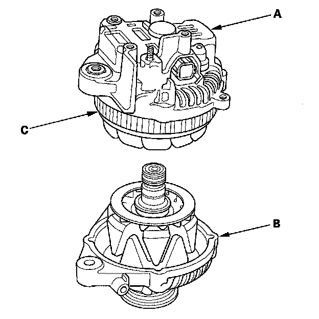 8. Separate the rear housing (A) and drive end housing (B) with the stator (C) attached to the rear housing.