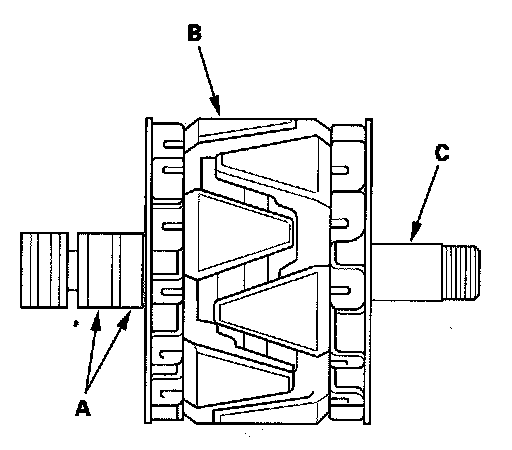 19. Check for no continuity between each slip ring (A) and the rotor (B) and the rotor shaft (C).