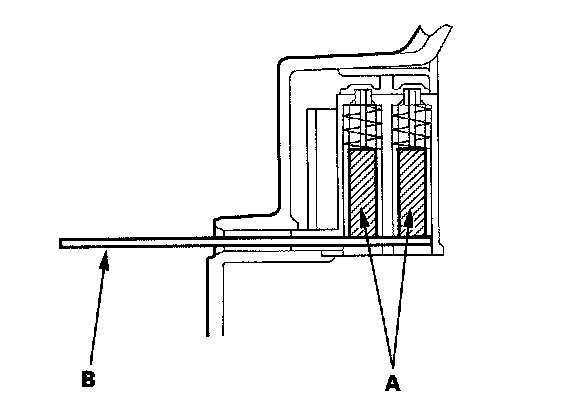22. Push the brushes (A) in, then insert a pin or drill bit (B) (about 1.8 mm (0.77 in.) diameter) to hold them there.
