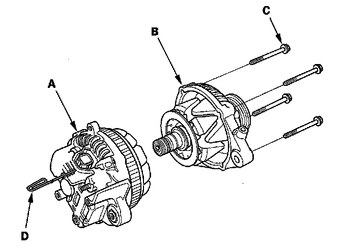 24. Put the rear housing assembly (A) and drive end housing/rotor assembly (B) together, tighten the four through bolts (C), and pull out the pin (D).