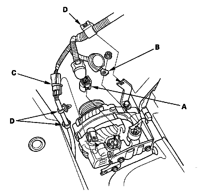 5. Remove the harness connector (C) and harness clamps (D) from the alternator.