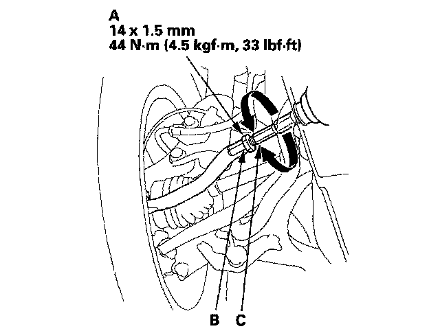 3. Loosen the tie-rod locknuts (A) while holding the flat surface sections (B) of the tie-rod end with a wrench, and turn both tie-rods (C) until the front toe is within specifications.