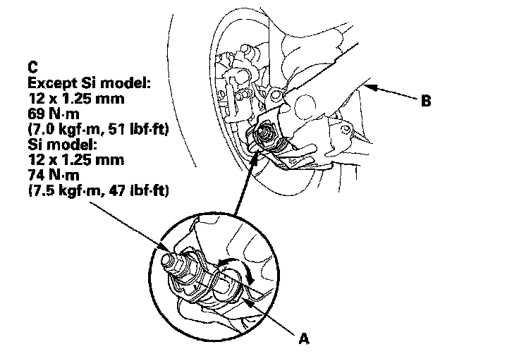 3. Hold the adjusting bolt (A) on the trailing arm (B), and remove the self-locking nut (C).