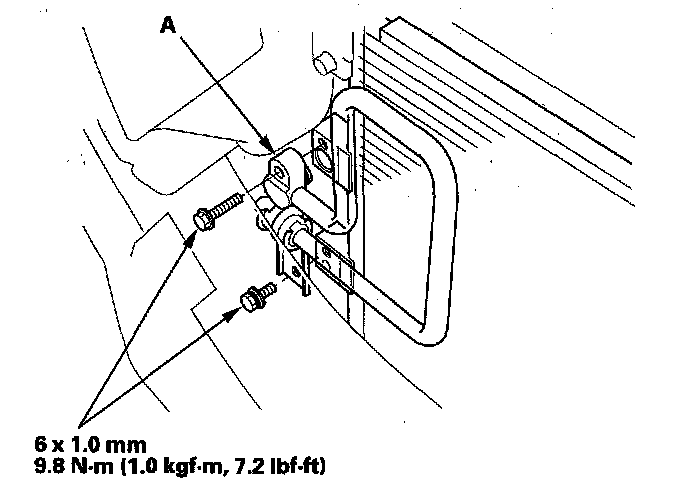 3. Remove the bolts, then disconnect the discharge hose (A) from the A/C condenser.