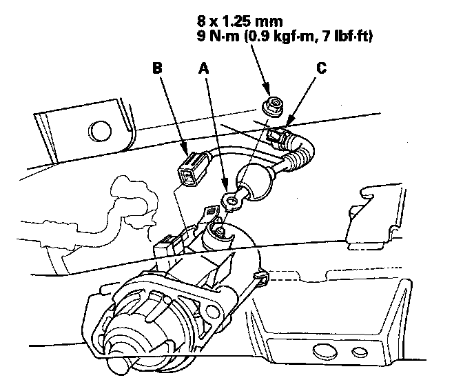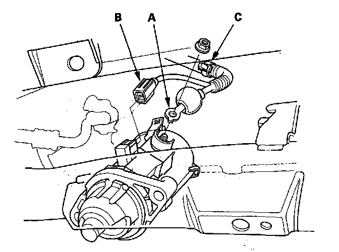 1. Install the starter cable (A) and BLK/WHT (B) wire. Make sure the starter cable crimped side of the ring terminal faces away from the starter when you connect it.