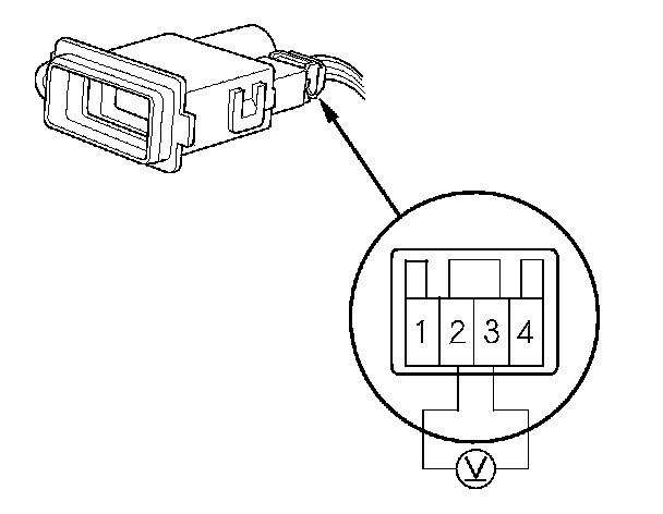 2. Turn the ignition switch to ON (II). Measure the voltage between the terminals with the (+) probe on terminal No. 3 and the (-) probe on terminal No. 2 with the connector connected.