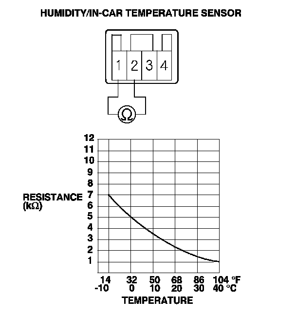 3. Compare the resistance reading between terminals No. 1 and No. 2 of the humidity/in-car temperature sensor with the specifications shown in the graph; the resistance should be within the specifications.