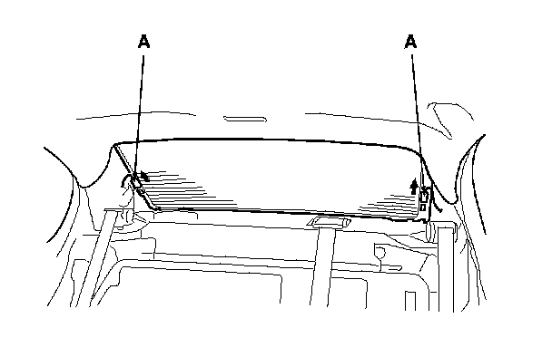 4. Pull down the rear portion of the headliner (A) by detaching the clips. Take care not to bend the headliner excessively, or you may crease or break it.