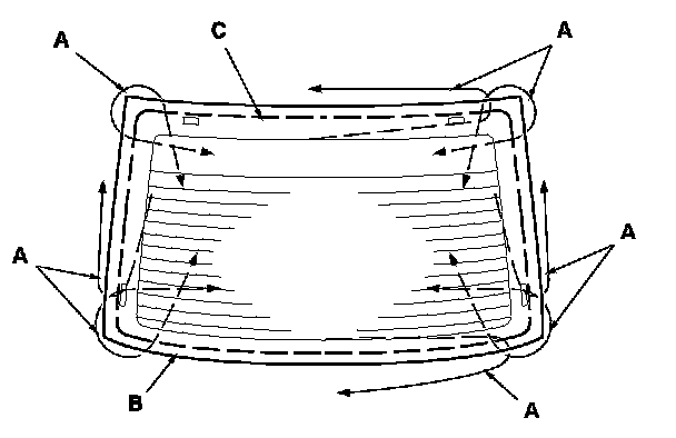 20. Put the cartridge in a caulking gun, and run a continuous bead of adhesive (A) around the edge of the rear window (B) between the dams (C) as shown: