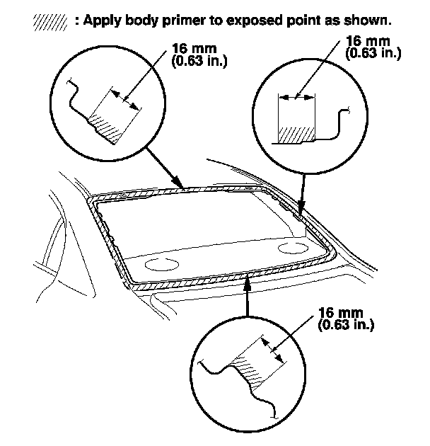 18. Carefully apply a light coat of body primer with a sponge applicator to any exposed paint or metal around the flange where the new adhesive will be applied. Let the primer dry for at least 10 minutes: