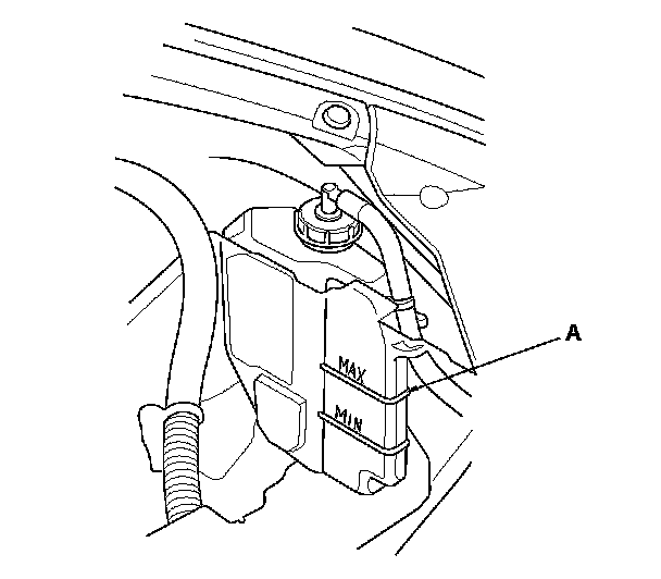 8. Fill the coolant reservoir to the MAX mark (A) with Honda Long Life Antifreeze/Coolant Type 2 (P/N OL999-9001).