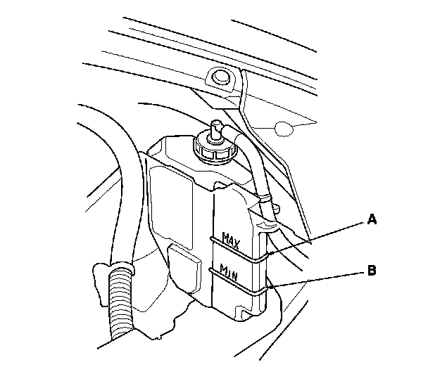 1. Check at the coolant level in the coolant reservoir. Make sure it is between the MAX mark (A) and MIN mark (B).