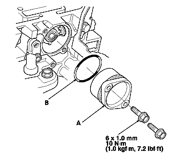 3. Install the camshaft thrust cover (A) with a new O-ring (B).