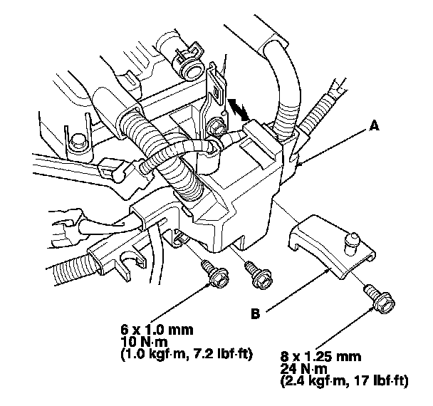 5. Install the harness holder (A) on the cylinder head, then Install the air cleaner bracket (B).