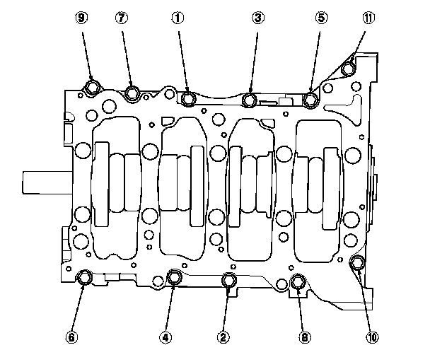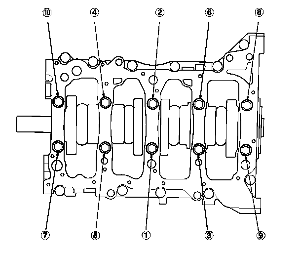 Main Bearing Cap Torque and SequenceTighten the bearing cap bolts, in sequence, to 25 N-m (2.5 kgf-m, 18 lbf-ft).