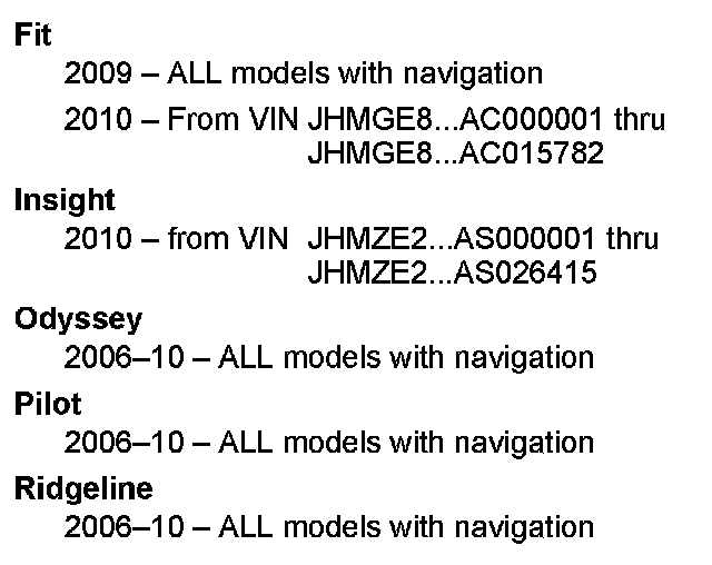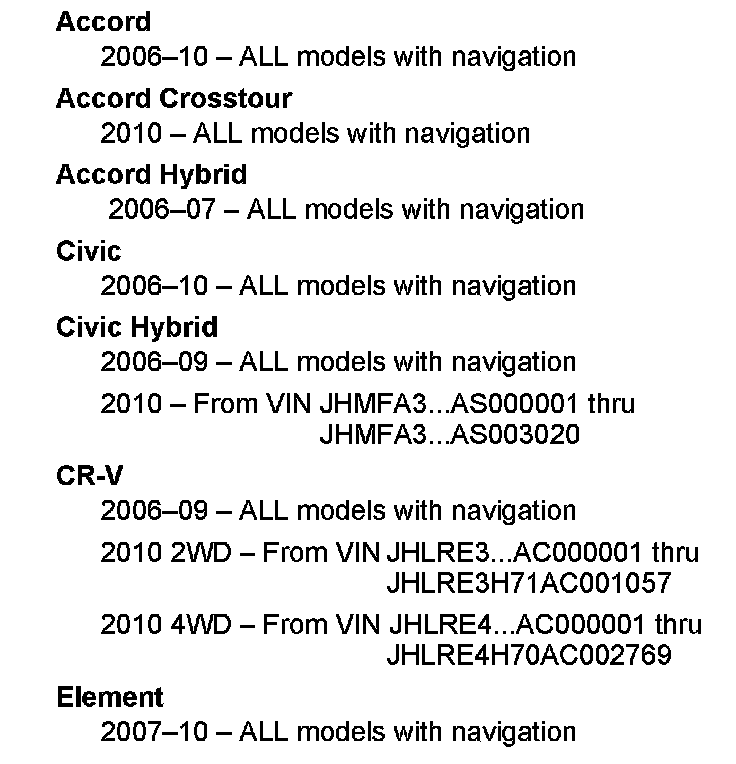 2. Check that the navigation DVD is the correct color and version for the vehicle. Refer to Service Bulletin 05-032, Navigation System In formation, for more information. If the DVD is not the correct base DVD version or higher, replace it and retest.