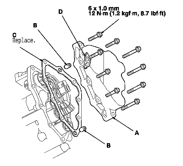 8. Remove the shift solenoid valve cover (A), the dowel pins (B), the gasket (C), and the harness clamp bracket (D).