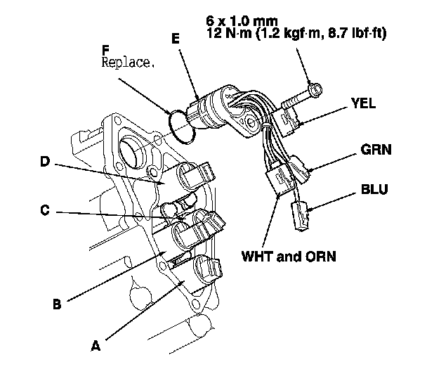 10. Install a new O-ring (F) on a new shift solenoid harness connector, and install the connector in the transmission housing.