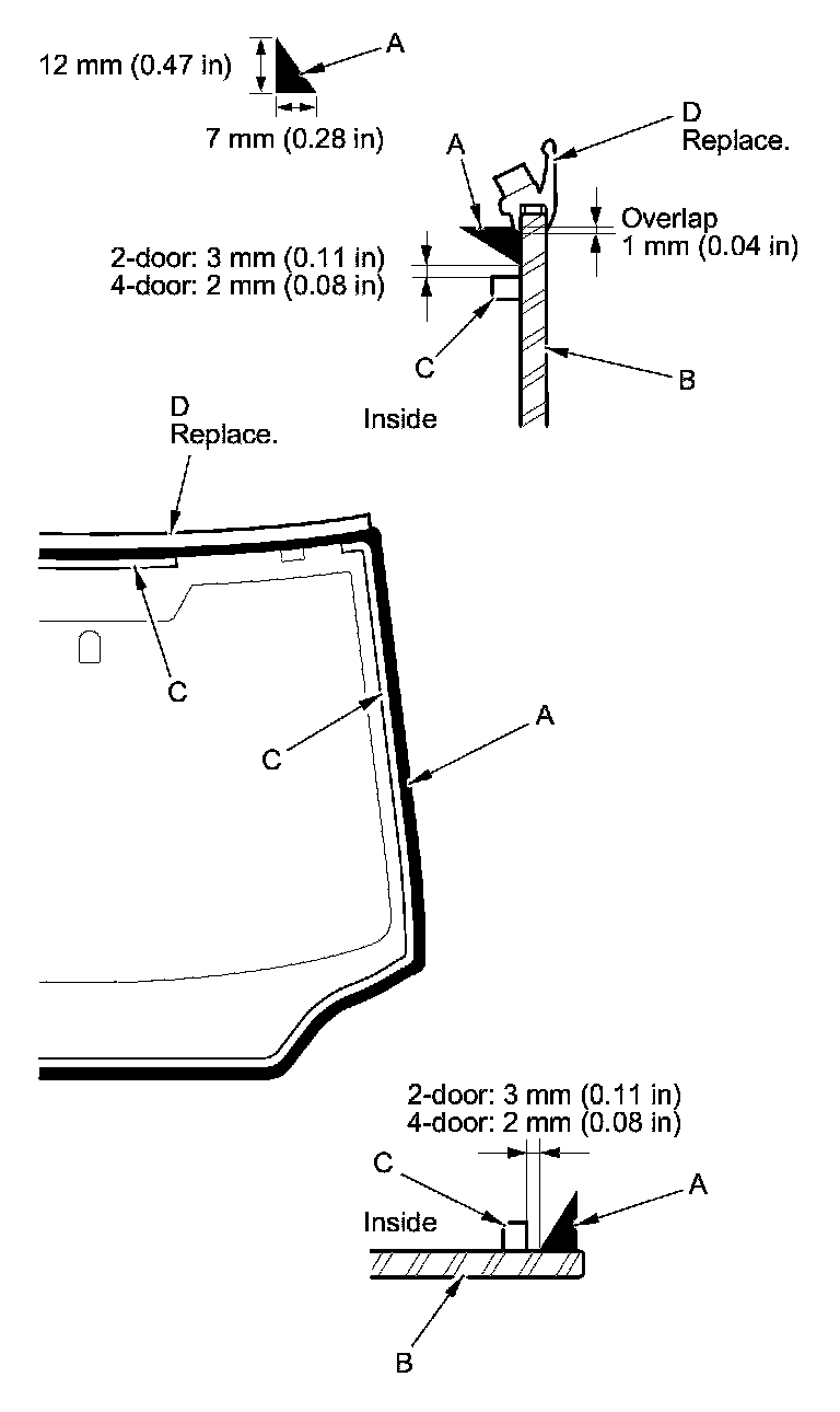 11. Apply glass primer to the upper clip mounting areas on the windshield (A), and let it dry. Remove the adhesive backing and attach the upper rubber dam (B), the side rubber dam (C), and the upper clips (D) with adhesive tape to the inside face of the windshield as shown:
