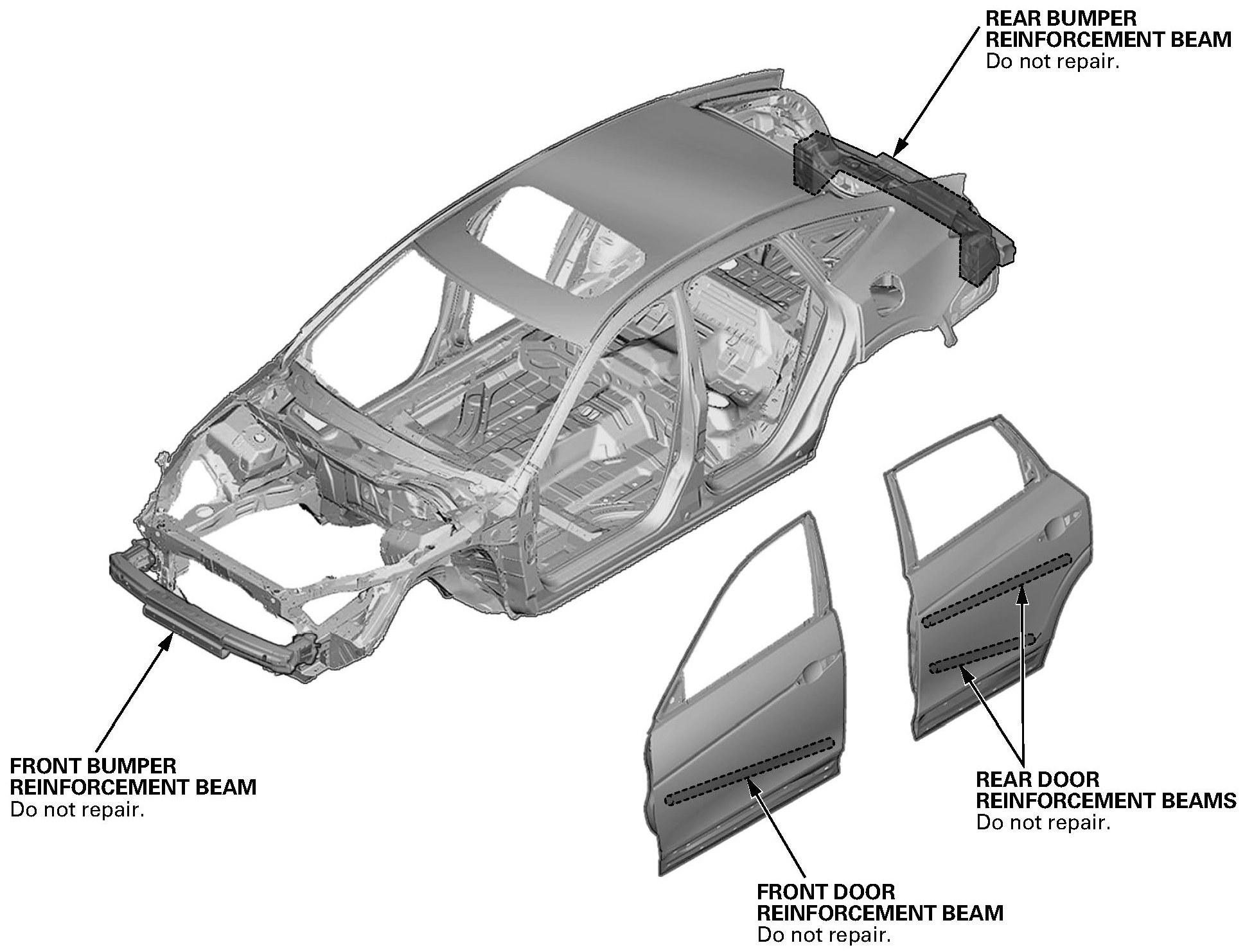 For this reason, the door and bumper reinforcement beams should NEVER be repaired; they must be replaced if they are damaged.