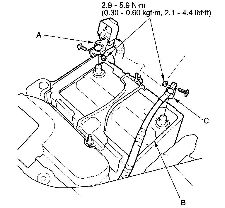3. Reconnect the positive cable (A) to the battery (B) first, then reconnect the negative cable (C) to the battery.