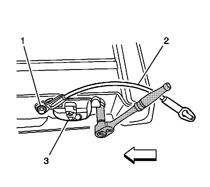 5. Remove the lower endgate shouldered latch bolt (1) from the latch assembly (3).