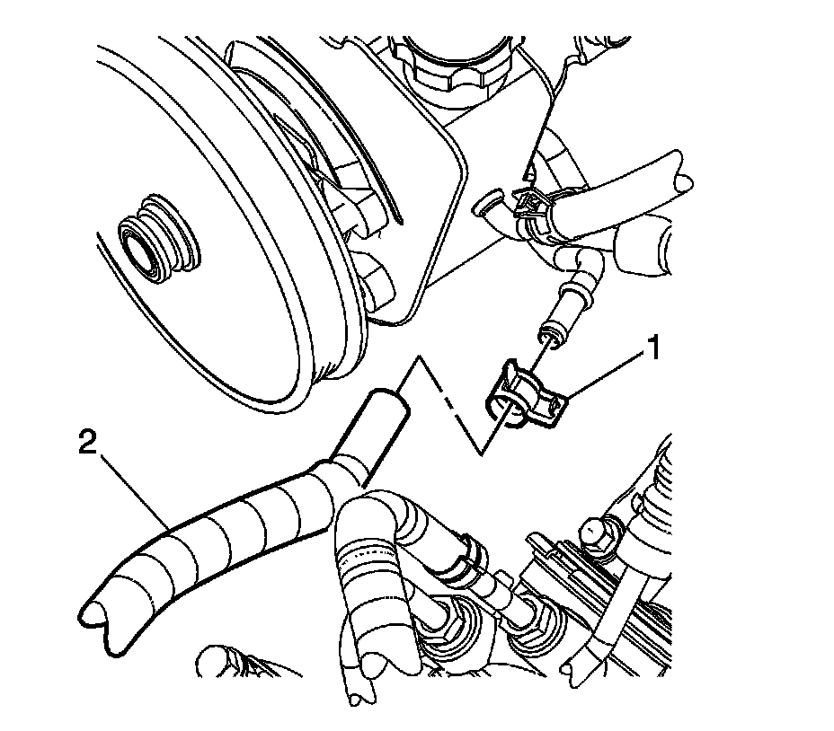 9. Compress the clamp (1) and disconnect the power steering cooler outlet pipe/hose (2) from the power steering pump.