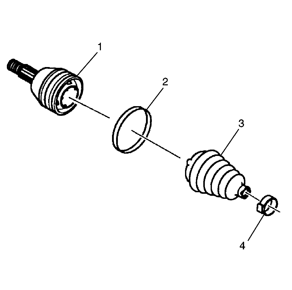 22. Slide the large diameter of the CV joint boot (1), with the large swage ring (2) in place, over the outside edge of the CV joint outer race (4).