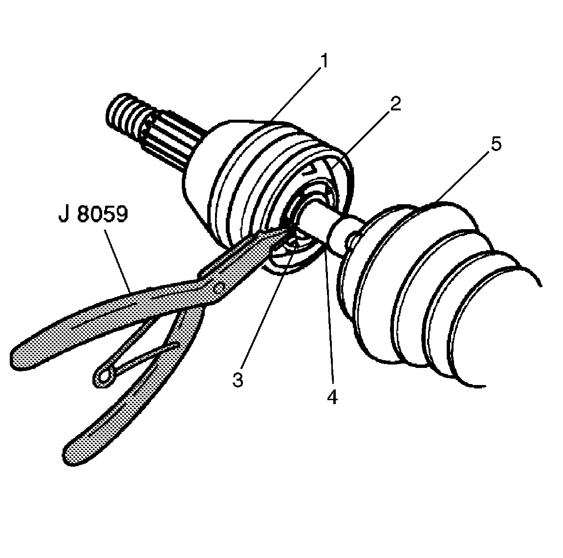 Important: Be sure that the retaining ring side of the CV joint inner race faces the halfshaft bar (3) before installation.
