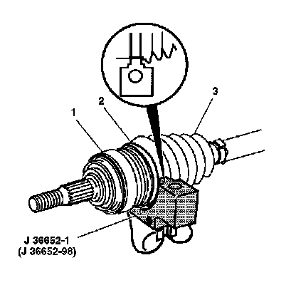 27. Install the top half of J 36652-1 or J 36652-2 onto the lower half of the tool, over the CV joint boot (3) and the CV joint assembly (1).