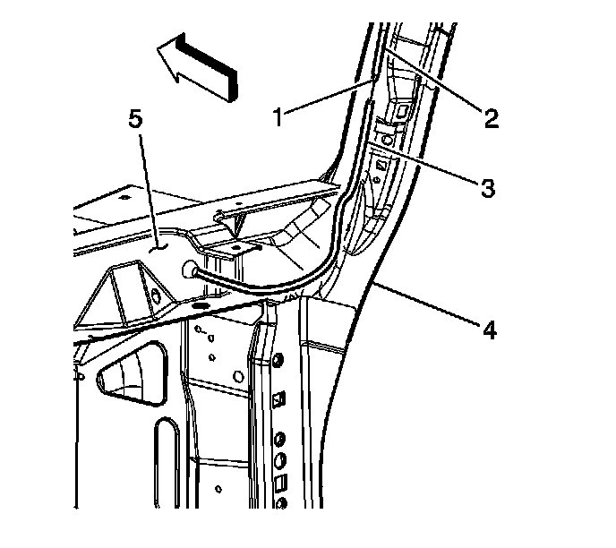 1. Position the washer pump to headliner hose (3) to the cowl area.