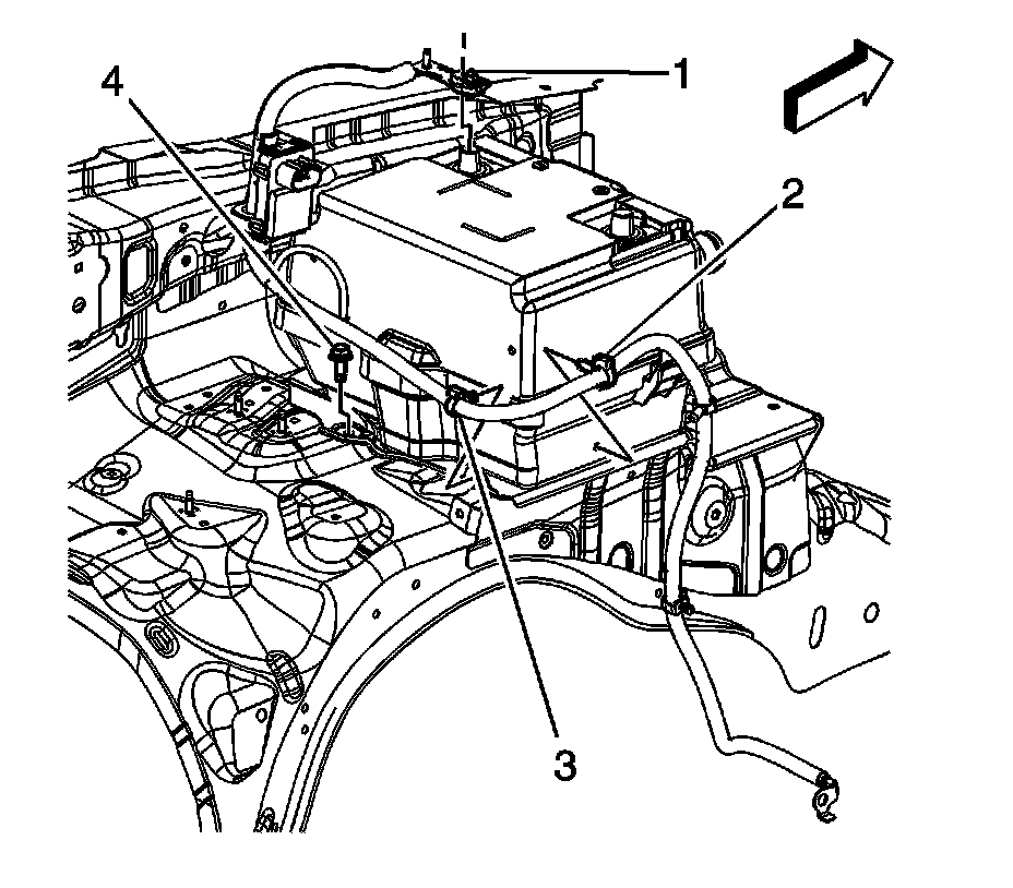 4. Remove the negative battery cable integral bolt (4) from the battery tray.