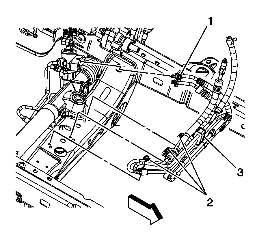 1. Install the power steering gear inlet and outlet hose (3) to the vehicle and connect it to the steering gear.