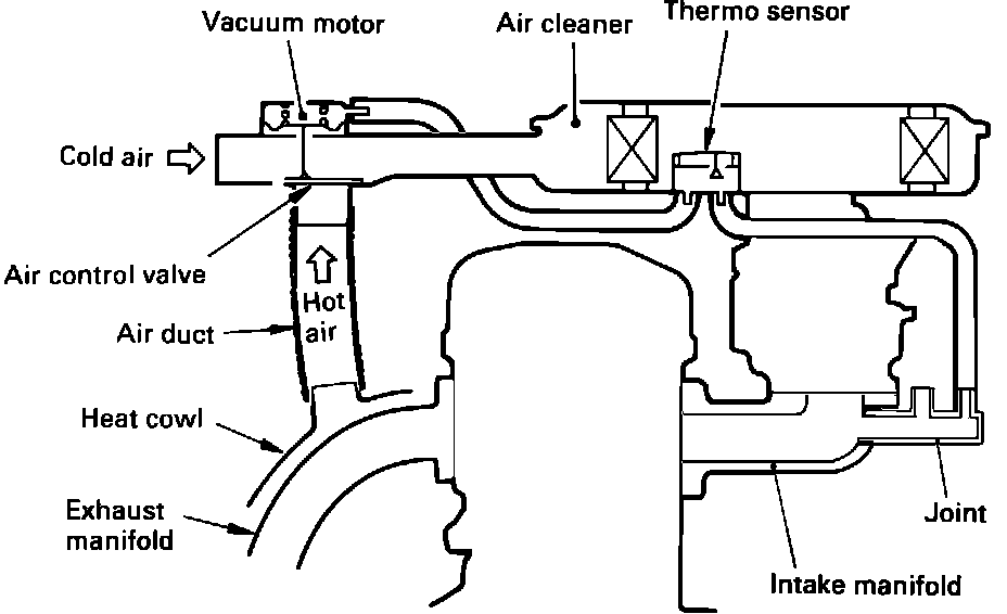 The air cleaner is of the conventional paper element carburetor mounted type. The air cleaner includes a valve to regulate the mixture of warm and cold air entering the carburetor. The air valve is operated by a vacuum motor controlled by a bi-metal thermosensor. These components comprise a heated intake air system (TAC) which allows the carburetor to be calibrated leaner than would ordinarily be possible to reduce CO and HC emissions during warm-up, improve cold engine driveability, and reduce carburetor icing.