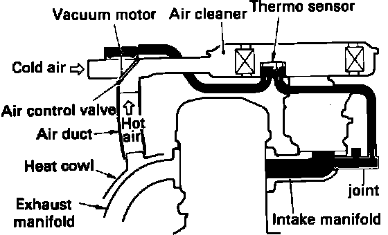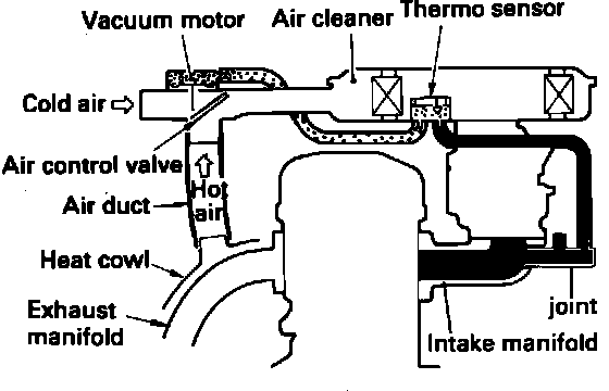 When the air inside the air cleaner is cold (less than 30 degrees C or 86 degrees F) the bi-metal thermo sensor remains air tight. Full intake manifold vacuum signal is applied to the vacuum motor holding the air control valve to the full heat position. Warmed air from the heat cowl enters the carburetor without mixing with cold air.