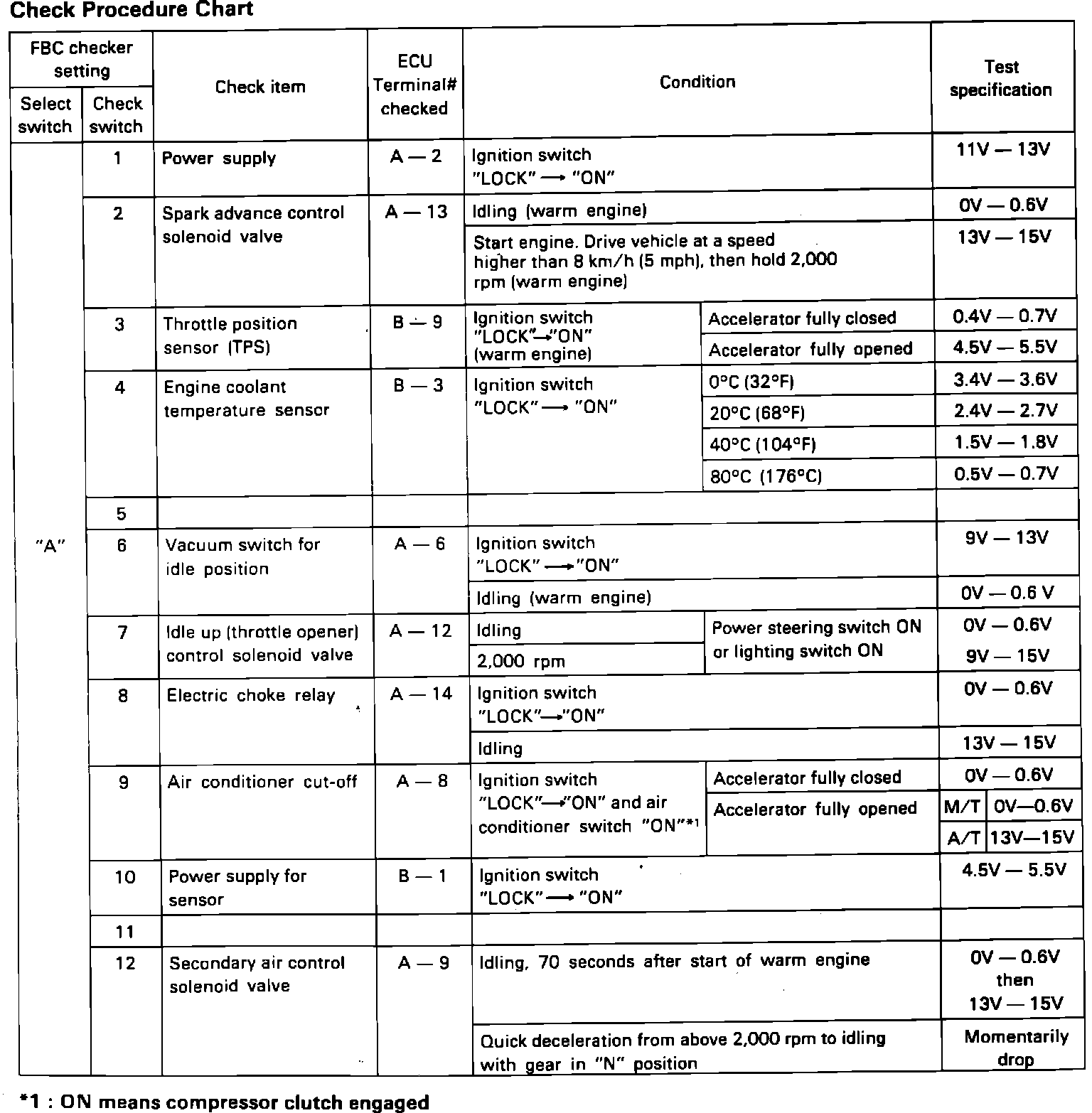 To test the Electronic Control Unit (ECU) the Hyundai FBC checker is recommended, although the tests on the Feedback Carburetor (FBC) System Check Procedures Chart, can be performed with the use of a suitable multi-meter.