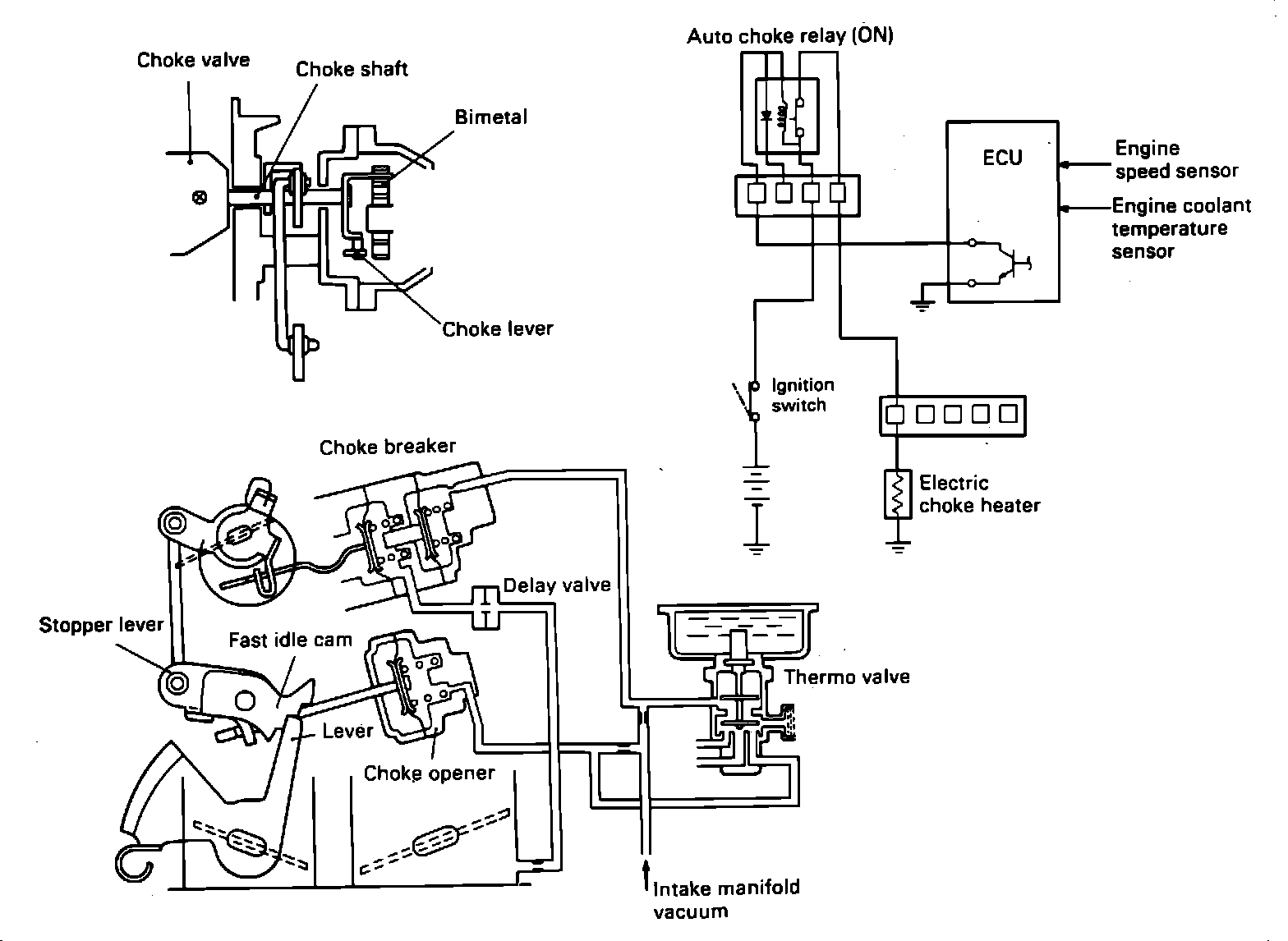 The electric choke relay contacts are normally closed (ON) and open when its coil is energized. During engine cranking or for approx. 80 seconds at an engine coolant temperature of -10 to 18°C (-14 to 64°F), the ECU energizes the electric choke relay coil. This prevents heating of the electric choke heater, until the engine has started.