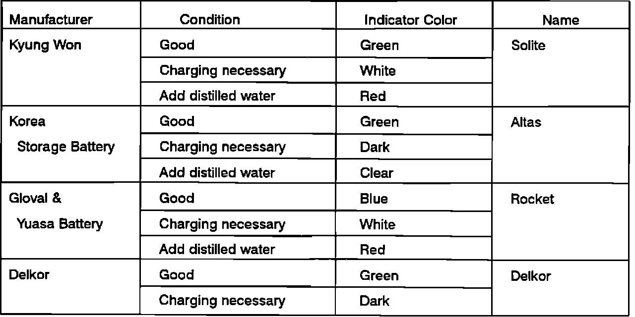 Hyundai Motor Company installs batteries from several suppliers into Hyundai vehicles. The Table lists the manufacturers and the characteristics of the charge indicators from each manufacturer.