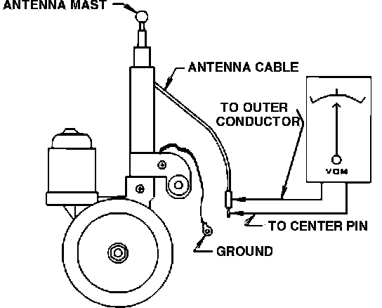 Using a Volt OHM Meter (VOM), check for continuity between the antenna mast and the center pin of the antenna cable. Continuity must be present. If there is no continuity, the antenna should be replaced.