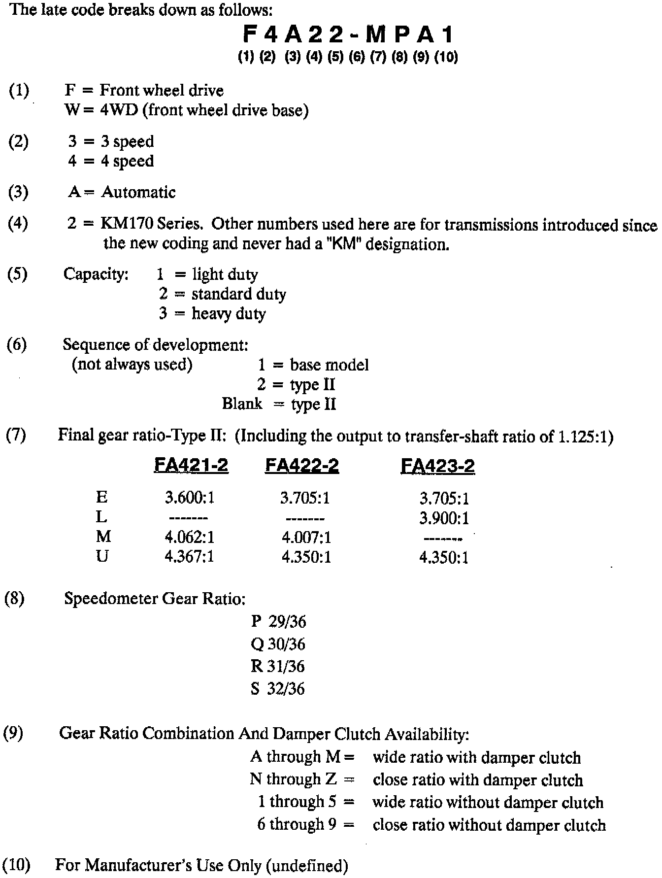 Beginning with the 1990 models, the KM170 Series Transaxles were given new coding. You will find the late code on the top of the case, or below the manual shaft. Figure 2 shows you an example of the new coding.
