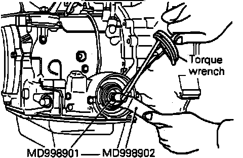 4. Hold kickdown servo piston using holding tool No. MD998902 or equivalent while torquing piston adjusting screw to 7.2 ft. lbs. using adapter tool No. MD998901 or equivalent, Fig. 9. Back off adjusting screw, then torque to 3.6 ft. lbs.