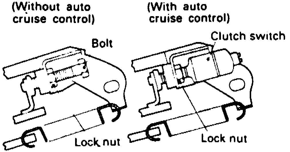 a. On models less auto cruise control system, when pedal height is higher than specified, turn bolt, Fig. 2, until pedal height is within specifications, then lock with locknut.