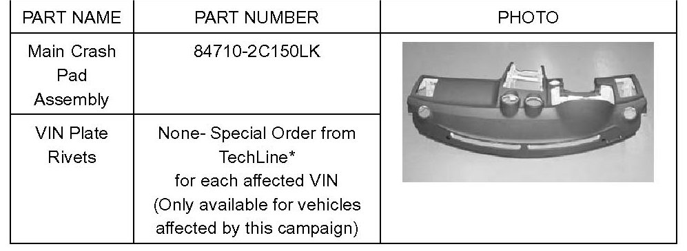 * Call the TechLine. Please have available the VIN and mileage for the vehicle to be repaired. The VIN will be cross-checked to determine if it is affected by the campaign. If it is affected, the special VIN Plate Rivets will be shipped. Be sure you have received the special rivets prior to starting the repair.