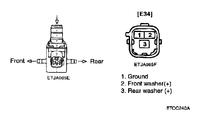 2. Connect positive (+) and negative (-) battery cables to terminals 2 and 1 respectively to see that the washer motor runs and water sprays from the front nozzles.
