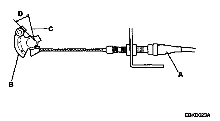 4. If the free play is not within specs, move the cable to the point where the engine speed starts to increase, and tighten the locknut (A) and adjusting nut (B).